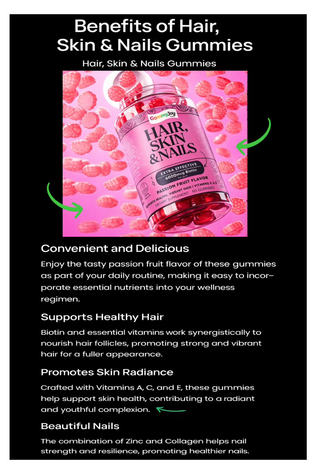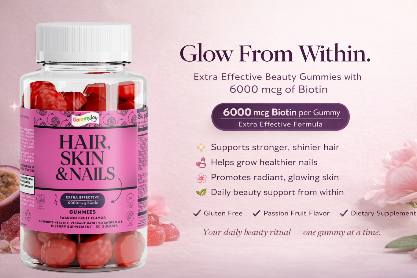 Our formula with 6000 mcg of biotin is designed to nourish hair from the roots, promoting stronger, shinier, and healthier-looking hair. It also supports stronger nails and a radiant complexion by aiding your body’s natural keratin production. Daily care that works from within to enhance your beauty from every angle.